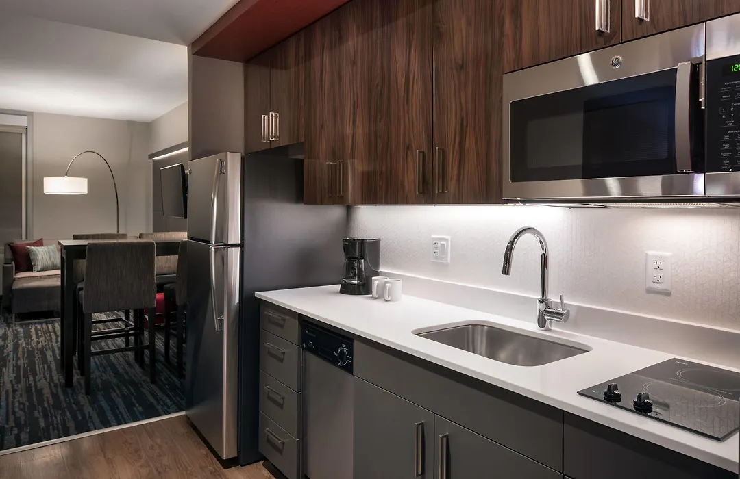The guest rooms at Residence Inn include air conditioning, a flat-screen TV with streaming services, and kitchenettes with full-sized refrigerators. Suites vary in size and feature a private bathroom, carpeted floors, and views of the city.