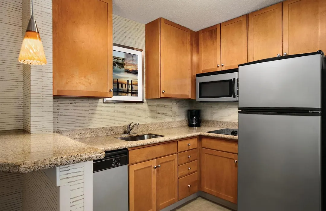 Rooms at Residence Inn feature air conditioning and fully equipped kitchens, including full-sized refrigerators, stovetops, and dishwashers. All suites come with a living area, sofa bed, and satellite TV, providing ample space for relaxation. Guests can choose from various suite types, which also include two-bedroom configurations.