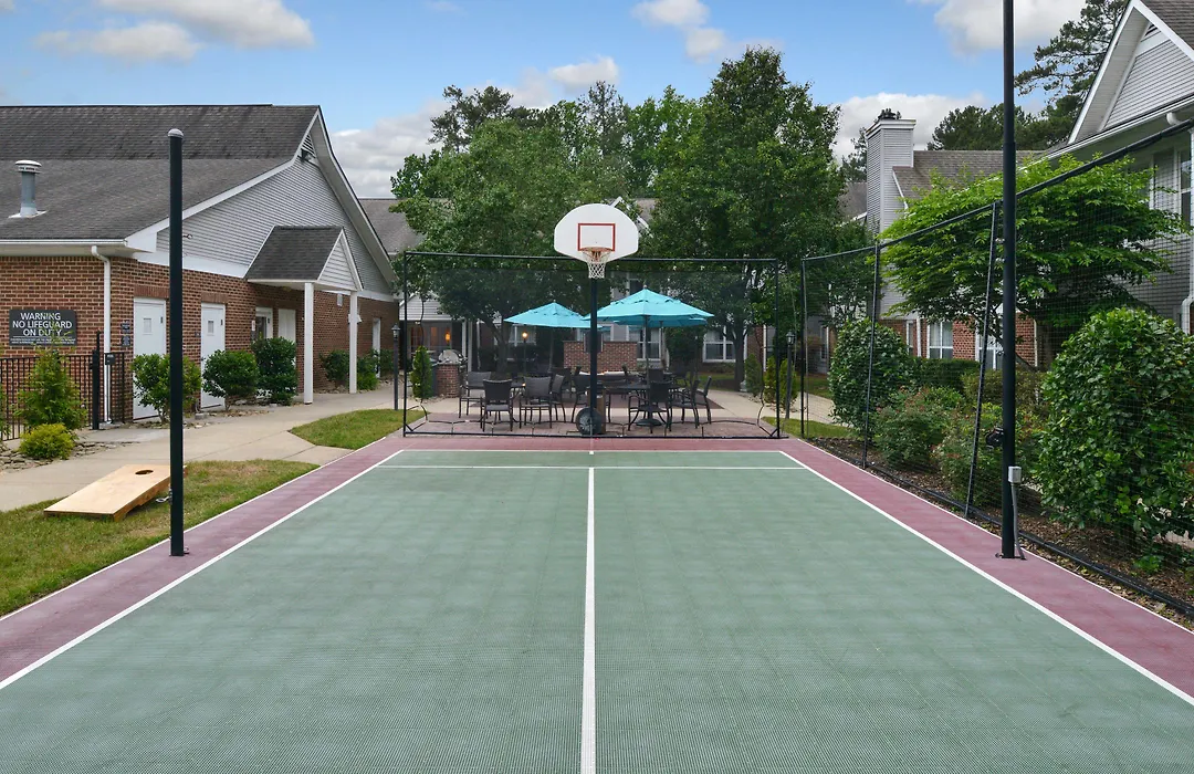 Recreational amenities include an outdoor pool, spa tub, and a multipurpose sports court for basketball. Surrounding activities feature golf at local courses such as Southern Pines Golf Club and Pinehurst Resort.