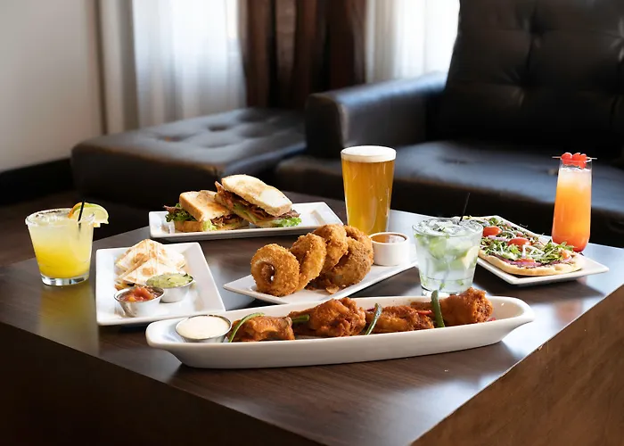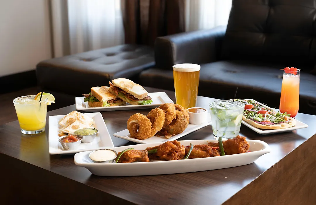 Guests can enjoy a complimentary hot buffet breakfast daily and a casual dining experience at RIVUE Bar and Grill for lunch and dinner. The hotel also has a 24-hour market for food and beverage options.