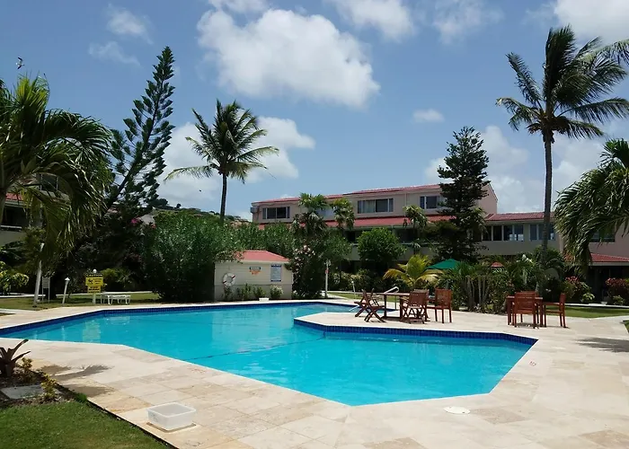 Antigua Village Beach Resort, a 3-star property rated 8.3/10 on Booking.com, features a private beach area, outdoor swimming pool, and lush gardens. The hotel offers individually styled studio, suite, and villa accommodations with full kitchens and tropical decor.