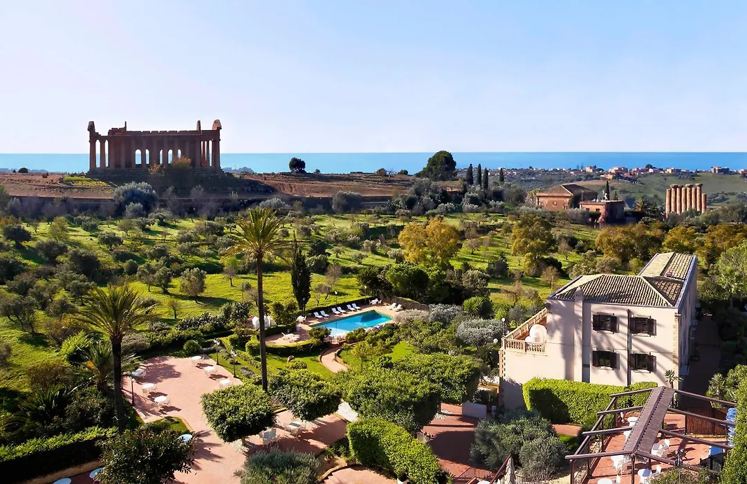 Villa Athena Resort, a 5-star hotel rated 9.3/10 on Booking.com, features an exclusive direct entrance to the UNESCO World Heritage Site of the Valley of the Temples. The property includes a full-service spa, outdoor pool, and renowned dining at the Terrazza degli Dei with panoramic views.