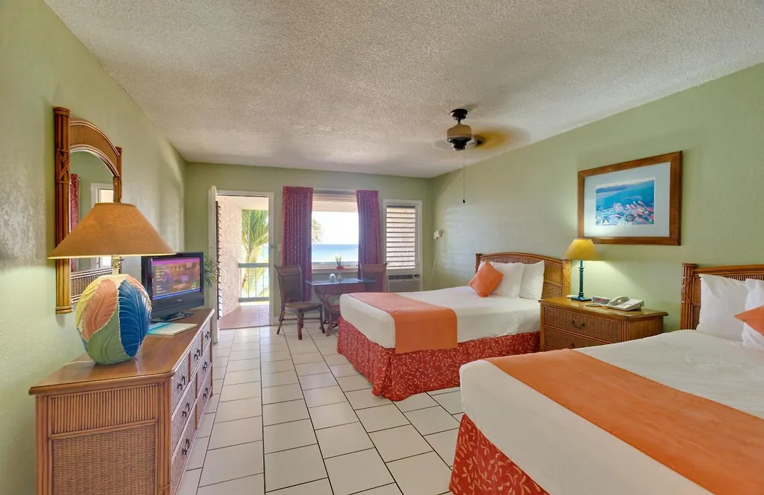 Rooms at Bolongo Bay Beach Resort All Inclusive feature private balconies overlooking the Caribbean Sea, providing easy beach access. Each room includes air conditioning, complimentary WiFi, a flat-screen TV, and eco-friendly bath items, ensuring a comfortable stay.