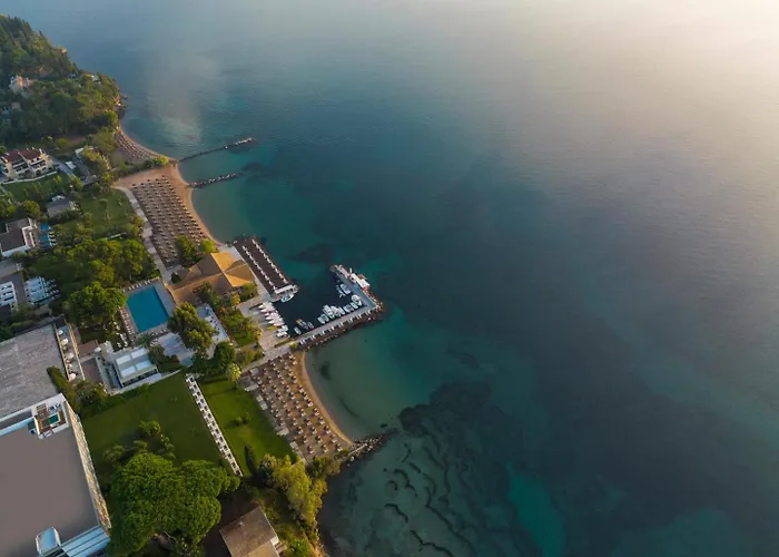Kontokali Bay Resort & Spa, a 5-star property with a 9.1/10 Booking.com rating, features a beachfront setting with a Blue Flag awarded beach and a large salt-water overflow pool. This resort offers bungalows, suites, and elegantly designed rooms, alongside amenities such as tennis courts and water sports facilities.