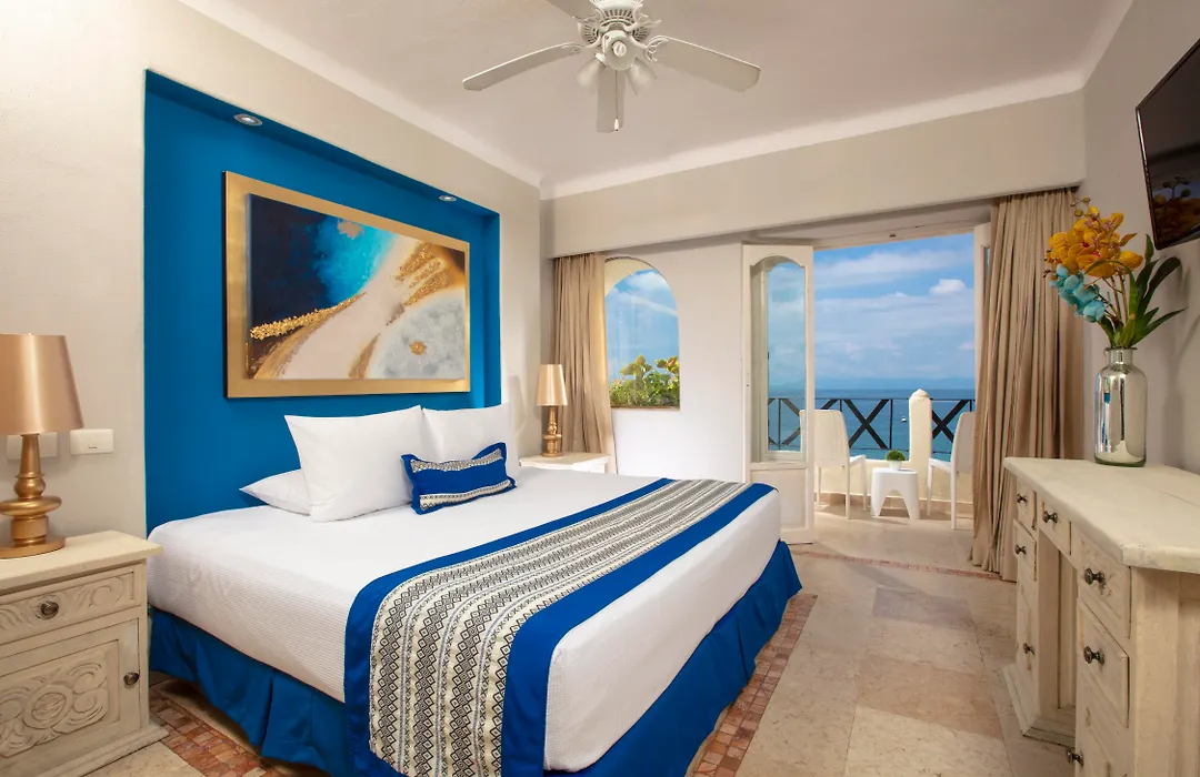 Rooms at Blue Chairs Beachfront Resort Puerto Vallarta - Adults Only include air conditioning, flat-screen TVs, and furnished balconies with ocean views. Suites feature up to two king-size beds, a kitchenette, living room, dining room, and two private bathrooms.