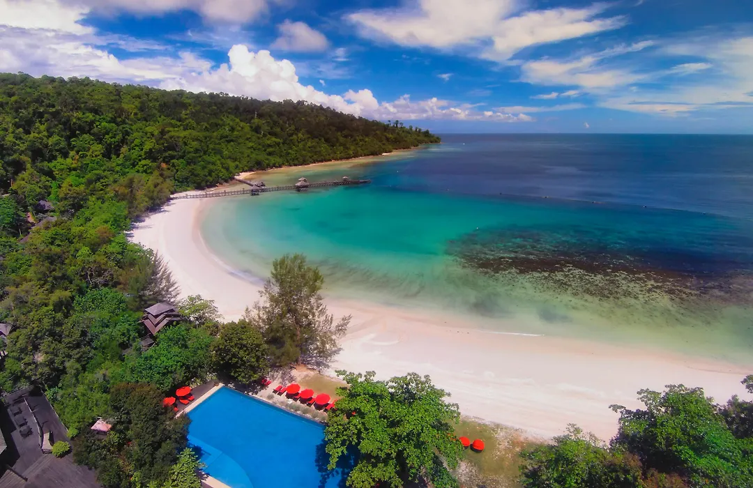 The resort is surrounded by pristine white beaches and lush jungle, providing a secluded experience for guests. Notable nearby attractions include Tunku Abdul Rahman Marine Park, Coral Flyer Zipline, and various islands for diving and exploring. Each villa's design facilitates an intimate connection with the natural environment.