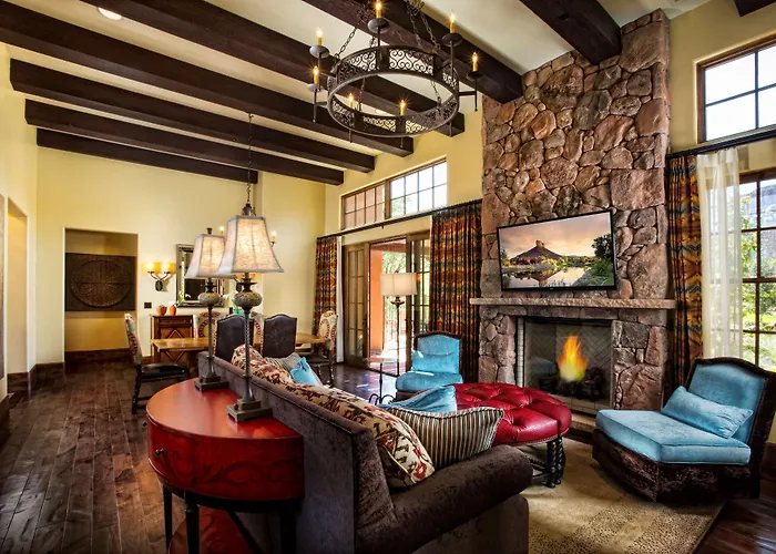 Rooms at Gateway Canyons Resort vary in style, including Premium Casitas with over 800 square feet of luxury and Stargazer Casitas with a deck for stargazing. Each room features amenities like a fireplace, complimentary Wi-Fi, and flat-screen TVs. The resort also ensures accessibility for guests with disabilities.
