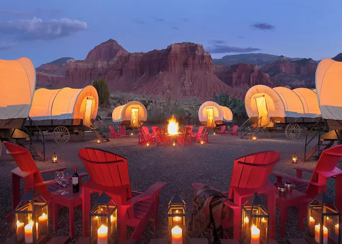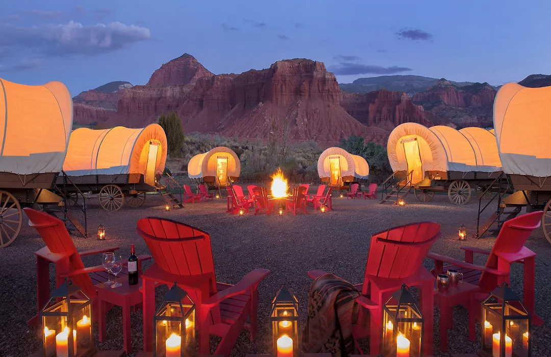 Offering unique accommodations such as Conestoga wagons and teepees, Capitol Reef Resort is a 3-star hotel boasting an 8.1/10 rating on Booking.com. It features an outdoor heated pool and the Pioneer Kitchen, known for its comfort food with views of Capitol Reef National Park. The resort spans 58 acres, providing stunning views of the Red Rock Cliffs.