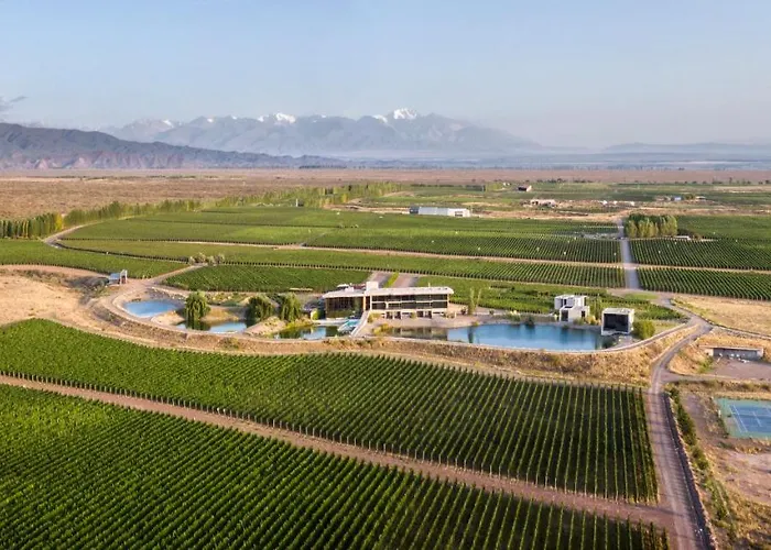 Casa De Uco Vineyards And Wine Resort showcases a blend of modern architecture amid lush vineyards at the foothills of the Andes Mountains. This 5-star eco-friendly wine resort features an outdoor pool, full-service spa, and an on-site restaurant, delivering diverse experiences in a picturesque setting.