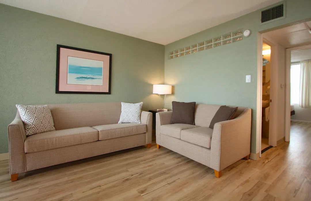 The Crusader Oceanfront Resort features 10 types of lodging accommodations, including efficiencies and one-bedroom suites with kitchenettes. Each room is equipped with modern amenities such as flat-screen TVs, a refrigerator, microwave, and coffee maker. Many rooms provide views of the ocean or pool from private balconies.