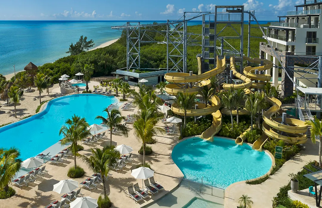 On-site leisure options include a main pool, lazy river, and children's splash pool, along with a water park featuring a Rollglider ride. The Dreams Spa by Pevonia offers rejuvenating treatments combined with elements inspired by local cenotes.