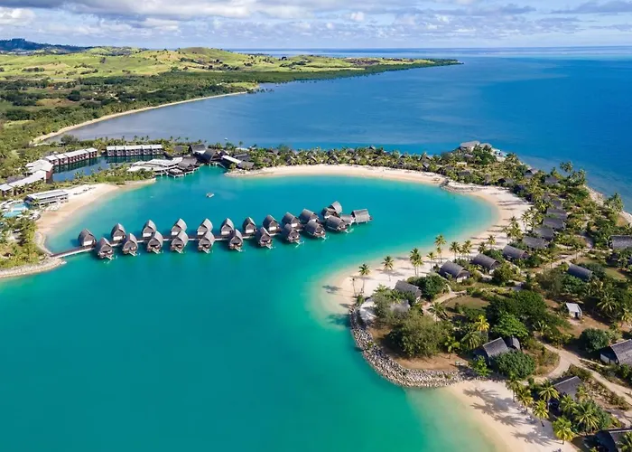 Fiji Marriott Resort Momi Bay features luxurious overwater bungalows and is a 5-star property with a wide range of amenities, including three destination restaurants, an infinity pool, and a health club. The resort is known for its breathtaking views and offers various family-friendly and adult-only experiences.
