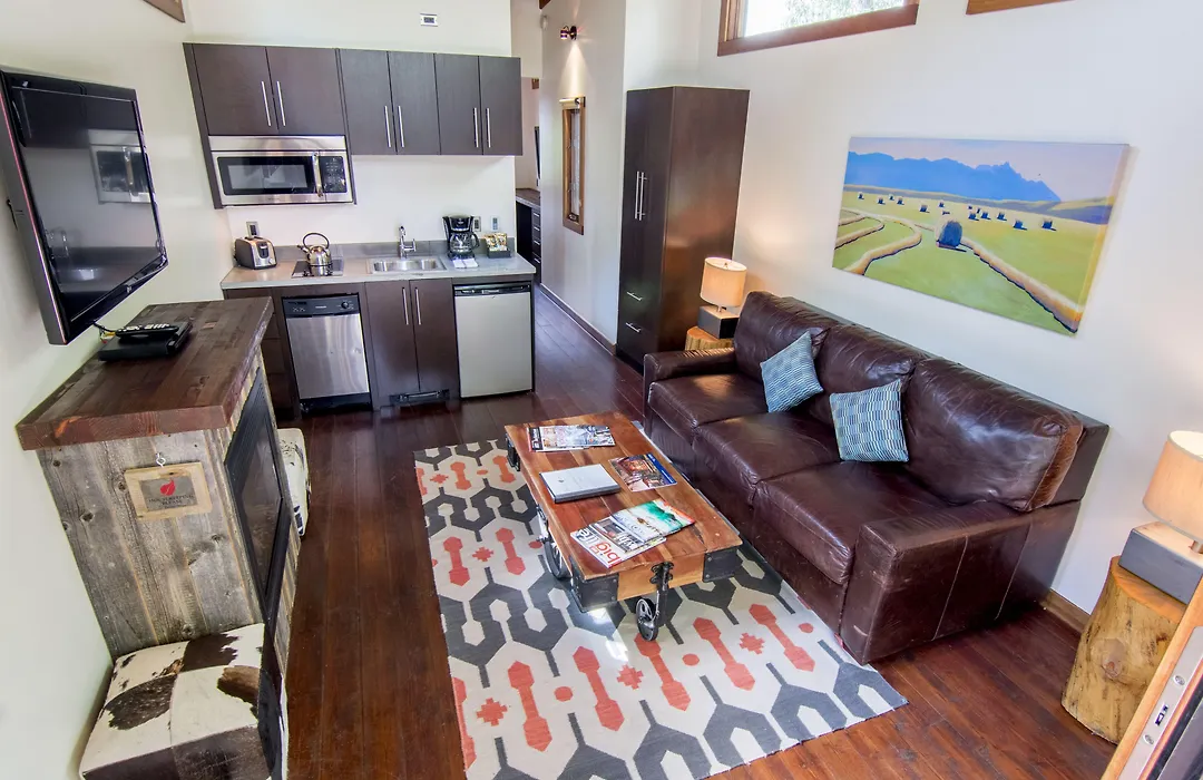 Each cabin at Fireside Resort features a kitchenette, a fireplace, and a private deck, with options like the Caboose Cabin that can sleep up to six people. Additionally, all cabins have outdoor fire pits for evening gatherings under the stars. Dog-friendly options allow guests to bring their pets along on their stay.