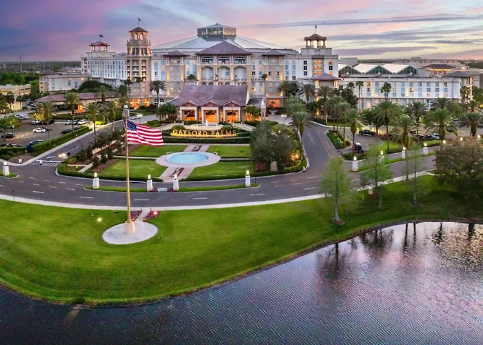 Gaylord Palms Resort & Convention Center, a 4-star family-friendly hotel, features a vast array of facilities set within grand glass atriums that reflect Florida's diverse landscapes. The resort offers nine dining options, a fitness center, a shopping arcade, and the expansive Cypress Springs Water Park.