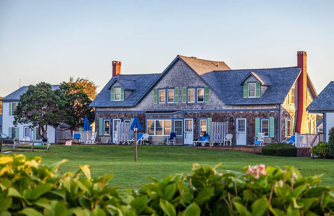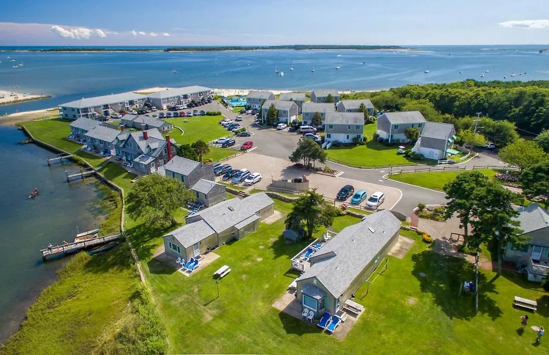 Rooms at Green Harbor Resort include fully equipped suites with kitchens and outdoor patio areas overlooking Lewis Bay inlet. Popular ocean-view end suites feature a main bedroom with two queen beds and a second bedroom with twin beds, ideal for families.
