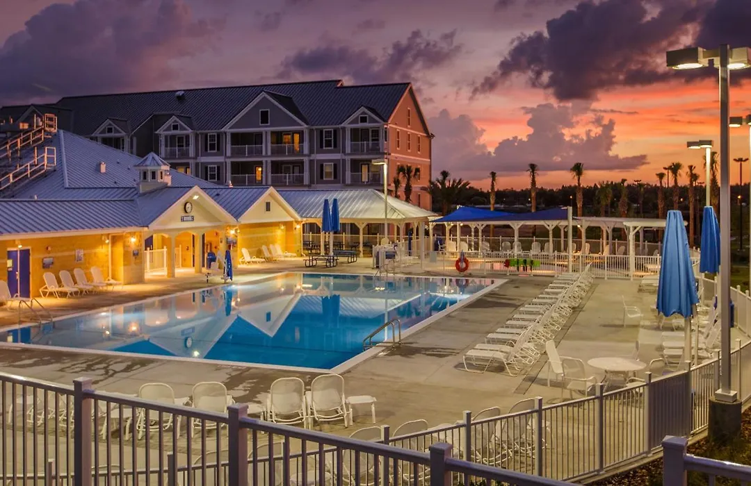 For leisure, the resort features two outdoor pools heated to 84 degrees, a kiddie pool, arcade, mini golf course, and sports courts. Guests can also utilize the fitness center for workouts and visit the movie theater for entertainment.