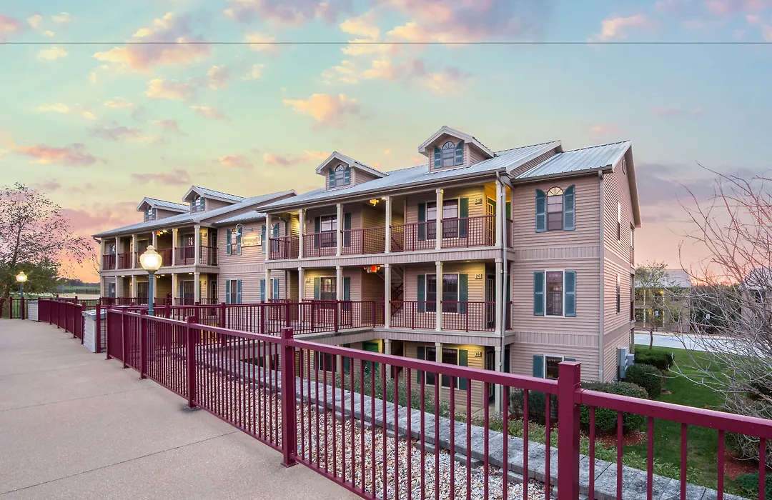 The Timber Creek Resort features spacious, condo-style two-bedroom villas, each 856-square-feet and equipped with a fully equipped kitchen, dining area, and living room space. Guests have access to high-speed internet, air conditioning, and a private balcony or patio.