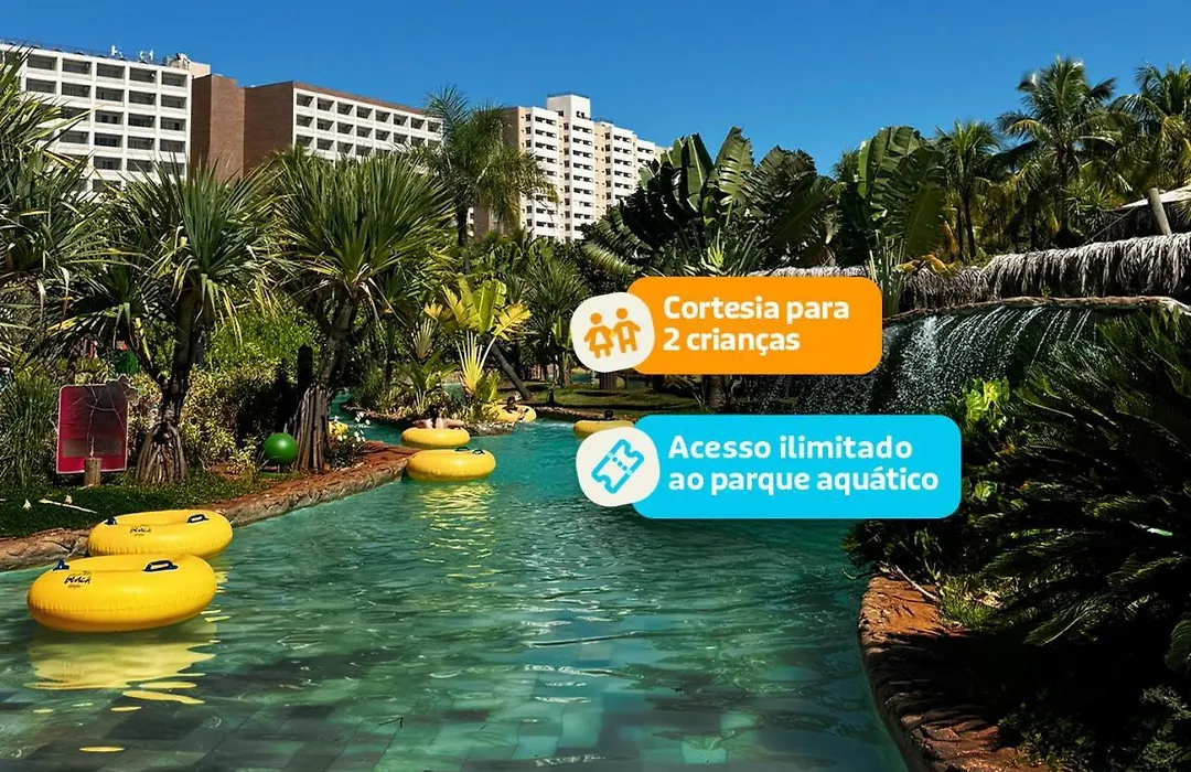 Hot Beach Resort offers a 5-star experience with a Booking.com rating of 8.7/10. Guests enjoy complimentary access to the Hot Beach Olímpia water park and a range of amenities including a restaurant, thermal pools, and kids' club.