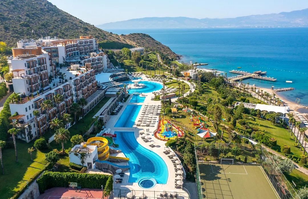 Kefaluka Resort, a 5-star beachfront hotel, features extensive leisure facilities including an Aqua Park and several dining options. This all-inclusive Akyarlar hotel offers 384 rooms with private balconies and stunning views over the Aegean Sea.