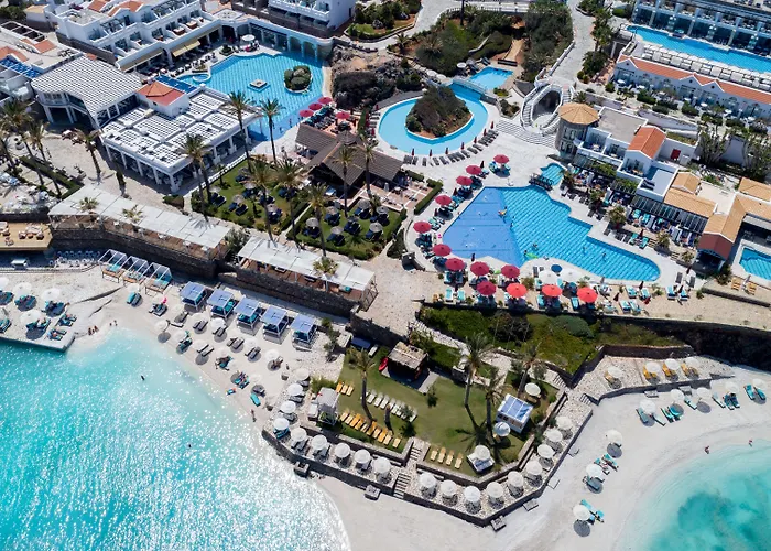 Minos Imperial Luxury Beach Resort & Spa Milatos is a 5-star family-friendly property offering multiple luxurious amenities including a private sandy beach and five swimming pools. The hotel features a range of exquisite villas with private pools and stylish furnishings, making it suitable for both relaxation and gatherings.