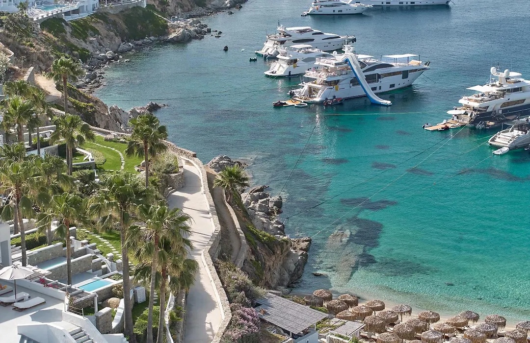 Rooms at Mykonos Blu range from whitewashed bungalows to luxurious villas, offering sea views and private terraces. All 103 accommodations include modern amenities such as air conditioning, premium bedding, and complimentary Wi-Fi.