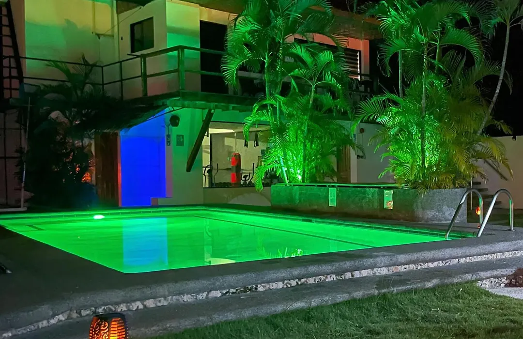 The resort offers daily organized activities including trips to Pescador Island and whale shark watching. Guests can also enjoy facilities such as billiard tables and ping-pong. The outdoor swimming pool, maintained without chlorine, provides a relaxing area for guests.