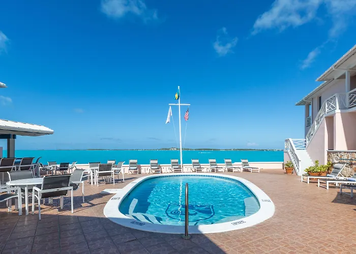 Recreational activities include an all-day boat excursion to the Exuma Cays for swimming with pigs or snorkeling at Fowl Cay's coral reefs. The resort's outdoor bar provides a scenic spot for cocktails.