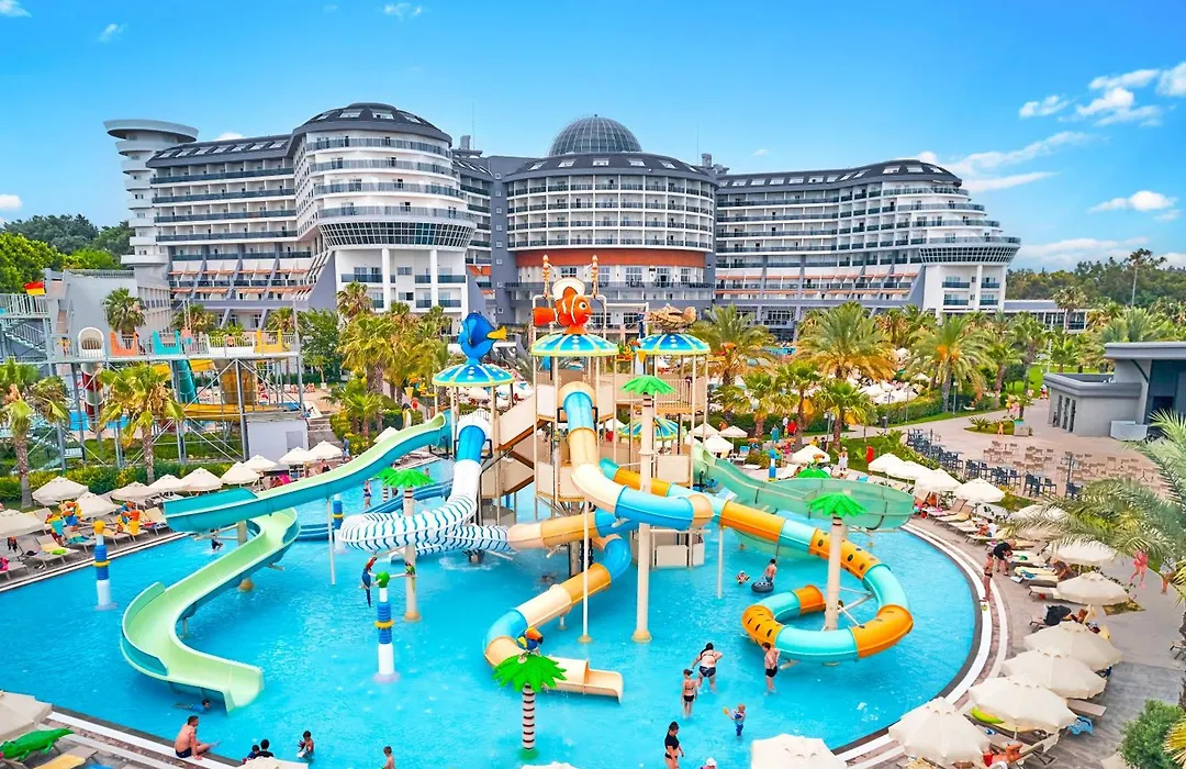 Leisure facilities at Seaden Sea Planet Resort & Spa feature outdoor and indoor pools, a children's pool with slides, a fitness center, and tennis courts. The spa center includes a Turkish bath, steam bath, and multiple massage rooms, while guests can unwind at several bars offering various beverages throughout the day.