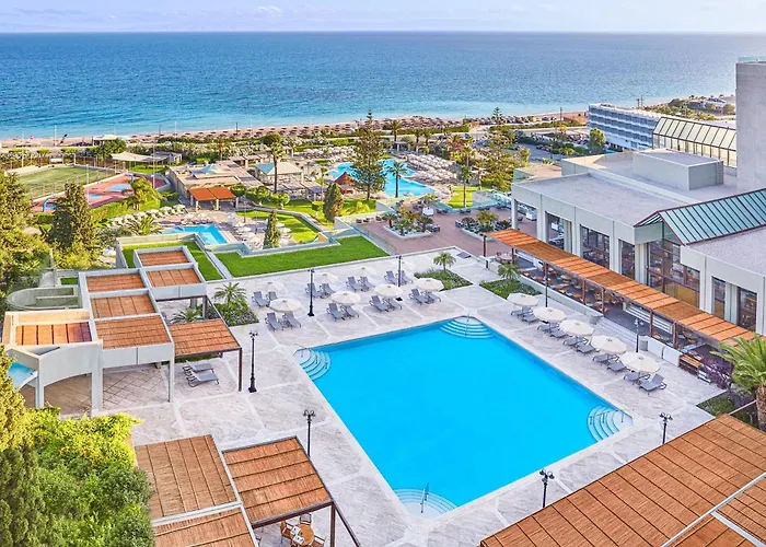 Sheraton Rhodes Resort is a 5-star Ixia (Rhodes) hotel with direct beach access through a private underground path. The property features multiple swimming pools, a full-service spa, and a Kids' Club for children ages 4-12, making it suitable for families and leisure travelers. With a Booking.com rating of 8.5/10, this resort is surrounded by lush gardens and offers various dining options.