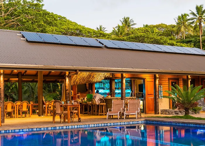 Taveuni Dive Resort, a 4-star accommodation with an 8.5/10 rating on Booking.com, features eight private bures designed for divers. The resort offers direct access to dive sites and a variety of amenities including an infinity pool and the Salty Fox Bar & Grill.