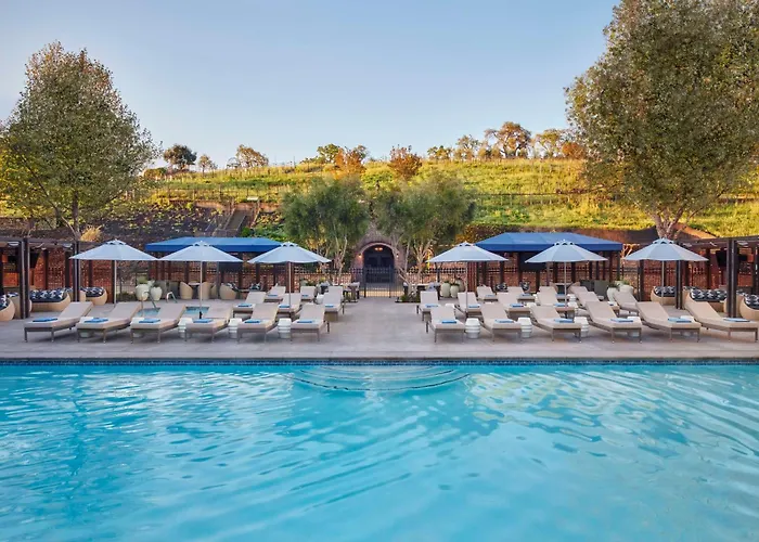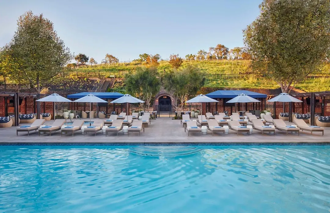 The Meritage Resort And Spa, a 4-star Napa hotel with a 7.7/10 rating on Booking.com, features expansive grounds that include a 9-acre vineyard, luxury spa, and multiple dining options. This resort offers elegant accommodations along with facilities such as two pools and a fitness center equipped with Peloton bikes.