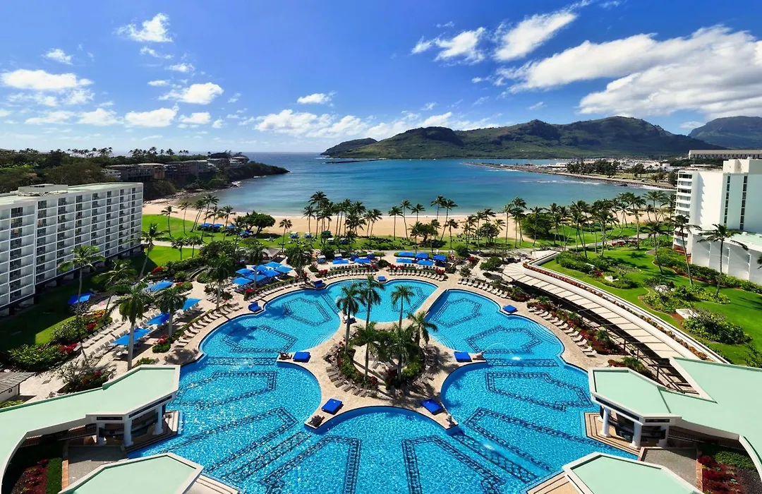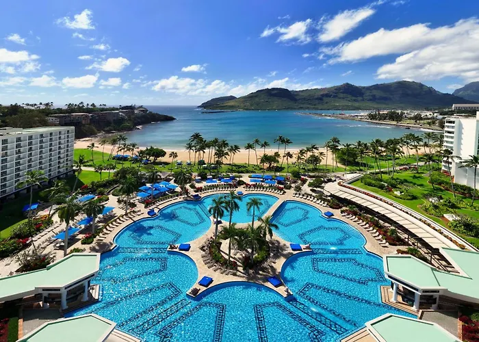 Royal Sonesta Kauai Resort Lihue, a 5-star beachfront hotel, offers immediate access to Kalapaki Beach and features Hawaii's largest family-friendly swimming pool. Additional amenities include four on-site restaurants, a spa, and extensive meeting facilities.