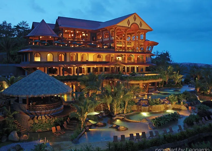 With a spectacular view of the Arenal Volcano, The Springs Resort & Spa At Arenal (5-star, 9.3/10 rating) offers natural hot springs, numerous dining experiences, and a full-service spa across its 165-acre property. Families can enjoy amenities such as a water slide, kids' game lounge, and the on-site Club Rio Adventure Center, which provides various activities.