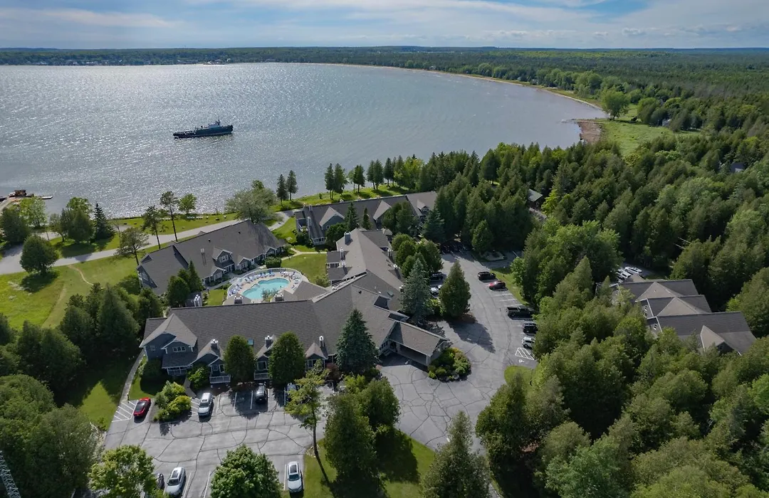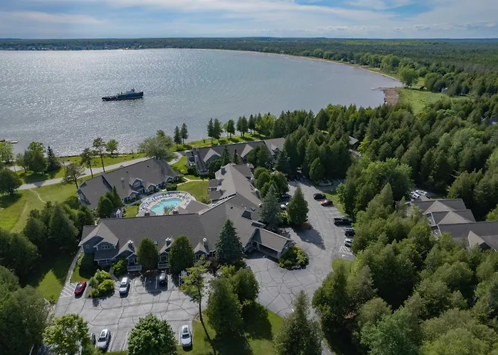 On-site amenities include access to indoor and outdoor pools, a sauna, and landscaped grounds overlooking the harbor. Guests can rent bikes or enjoy outdoor gas grills available for use. Nearby activities encompass hiking, fishing, and exploring the Ridges Sanctuary and Toft Point State Natural Area.