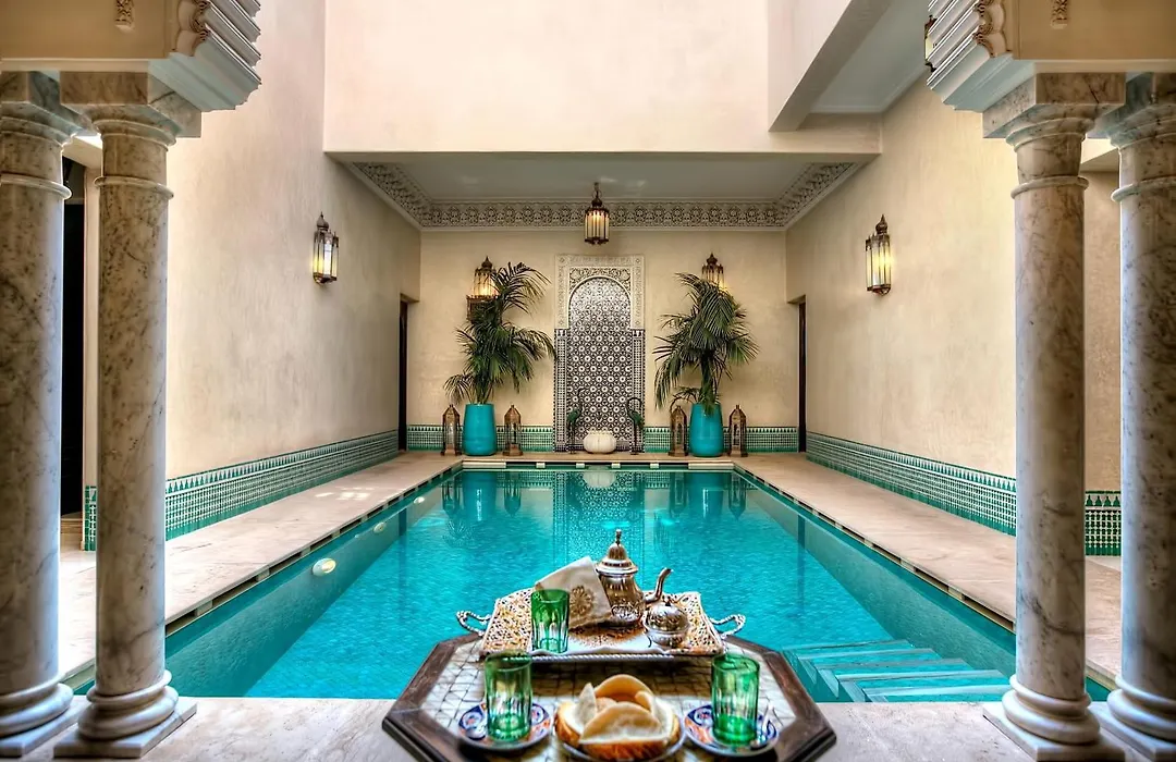 Riad Kniza, a luxury 4-star Marrakesh hotel with a 9.5 Booking.com rating, offers an authentic Moroccan experience in a completely restored 18th-century building. This charming hotel features an outdoor swimming pool, extensive gardens, and traditional Moroccan décor throughout its 11 uniquely designed rooms.