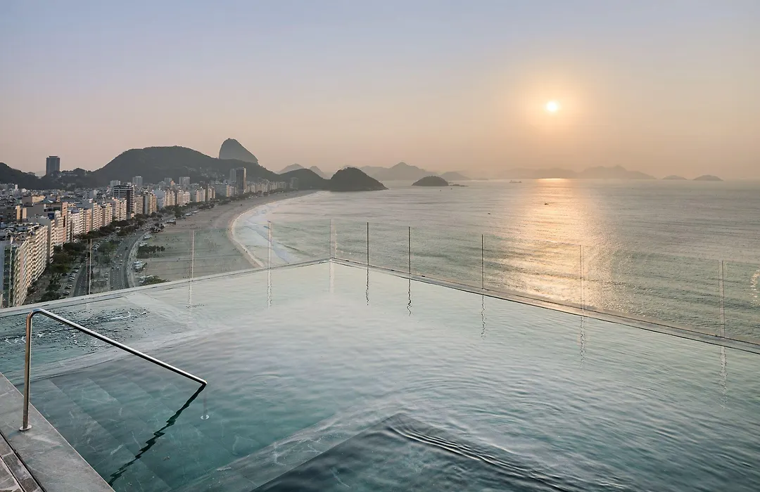 The hotel offers a rooftop pool with views of Sugarloaf Mountain and a hot tub for relaxation. Recreational options include a sauna and a fitness center, complemented by beach service that provides towels and chairs.
