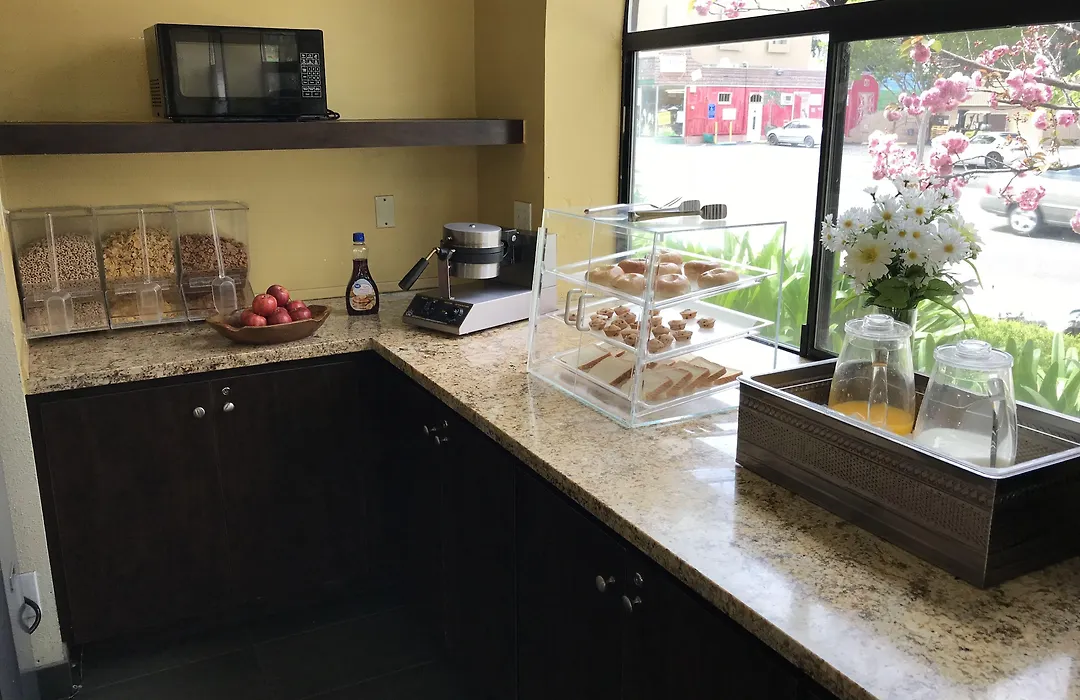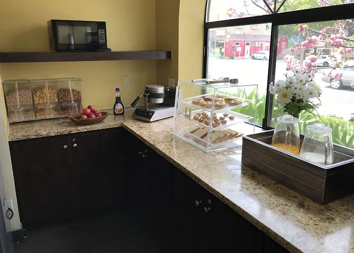 The hotel provides a complimentary continental breakfast, along with 24-hour coffee in the lobby. Nearby dining options include Taste Good Taiwanese Cuisine and Casa Azteca Mexican Restaurant, both within walking distance.