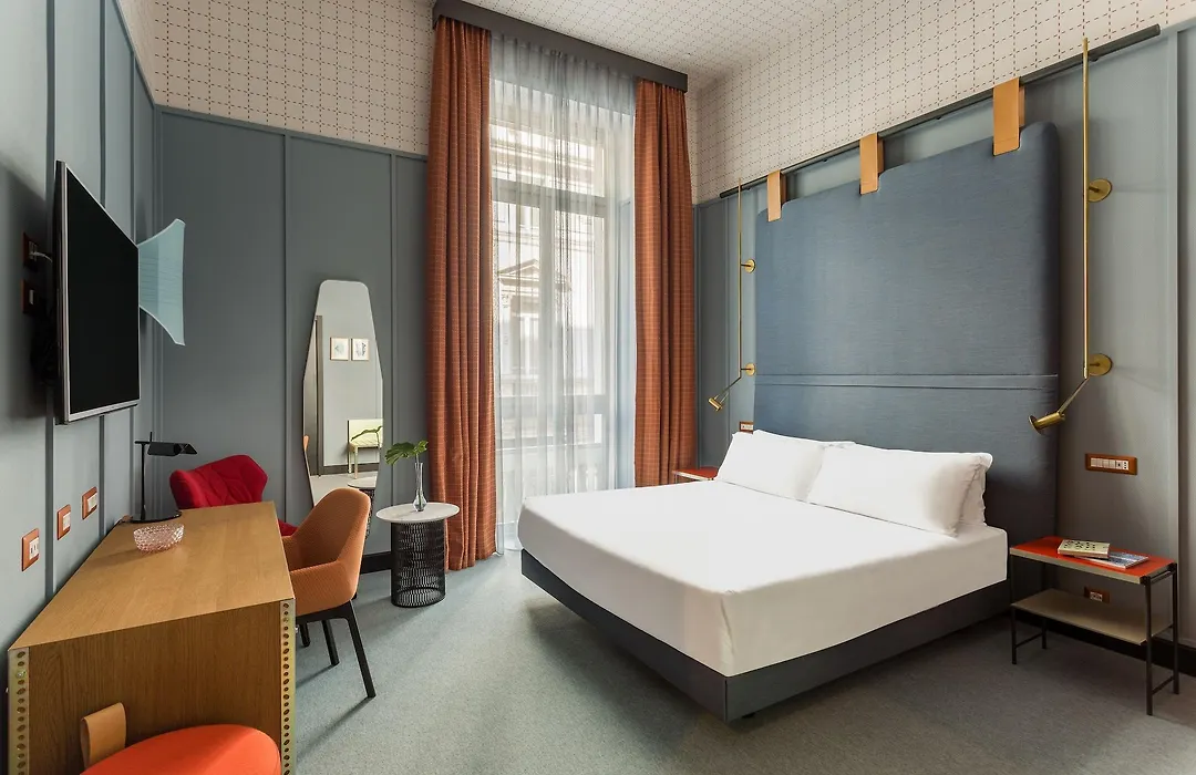The hotel offers 85 uniquely designed rooms, blending modern and vintage styles. Rooms include a flat-screen TV, USB/HDMI connections, a Nespresso coffee machine, and premium bedding. Many rooms feature vibrant colors and designer furnishings by Patricia Urquiola.