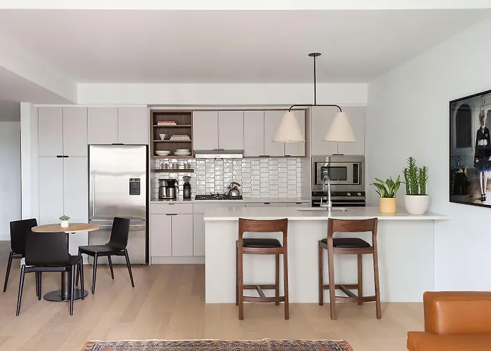 Accommodations at Roost East Market feature fully furnished apartments equipped with Bosch appliances, 4K Apple TVs, and SFERRA linens. Each unit includes a private bathroom, kitchen, and washer & dryer, providing both comfort and convenience.