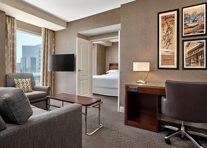 Sheraton Suites Calgary Eau Claire offers a sophisticated all-suite experience with a focus on comfort and modern amenities. This 4-star Calgary hotel features a trendy restaurant and convenient wellness facilities, positioned close to various attractions and dining spots.