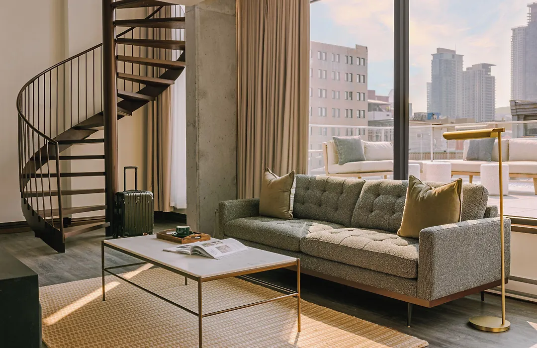The apartments at Sonder By Marriott feature air conditioning, a private bathroom, and a kitchen including a stovetop, refrigerator, and dishwasher. Each unit includes in-suite laundry and a flat-screen TV for entertainment.