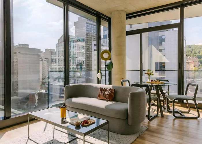 Sonder By Marriott Bonvoy Maisonneuve Apartments Downtown features a fitness center, terraces with views, and air-conditioned accommodations designed for longer stays. This 4-star Montreal hotel has fully equipped kitchens in each apartment and is rated 8.8/10 on Booking.com.