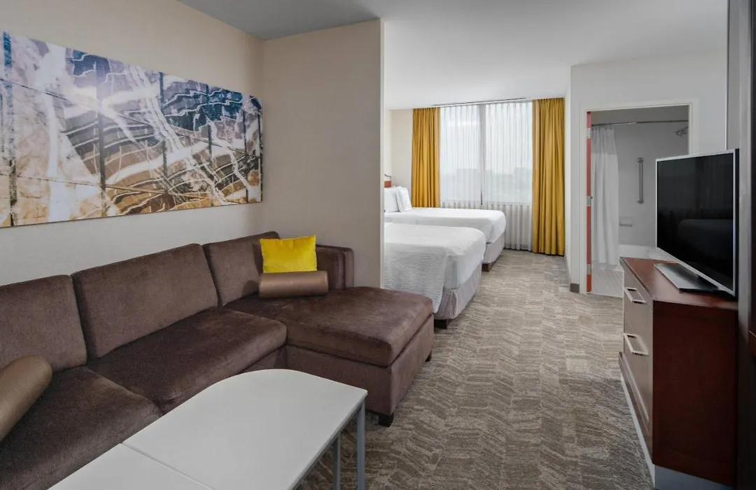 Rooms at Springhill Suites feature kitchenettes equipped with refrigerators and microwaves. Guests can enjoy amenities such as air conditioning, free Wi-Fi, 43-inch smart TVs, and spacious living areas. Some rooms include seating areas for relaxation.