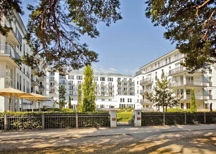 Steigenberger Grandhotel & Spa Heringsdorf is a 5-star resort hotel featuring a luxurious spa and wellness area. Guests can enjoy 167 rooms and suites with views of the beach promenade or the Baltic Sea. The hotel includes a variety of amenities, including five restaurants and bars, a kids club, and modern conference facilities.