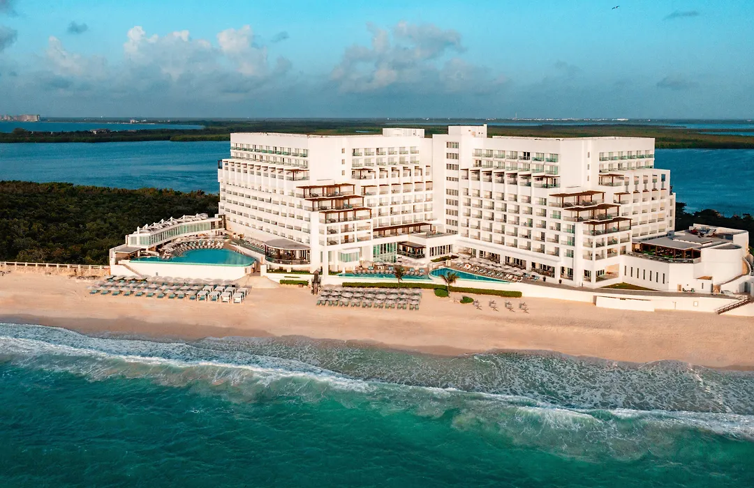 Sun Palace (Adults Only) is a 5-star Cancun hotel offering luxurious accommodations designed for couples. Features include a private beach area, an all-inclusive service, and signature amenities such as private check-in/out and a state-of-the-art fitness center. The property showcases a breathtaking view of the Caribbean Sea.