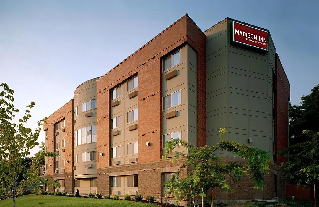 Rooms at The Madison Inn include modern amenities such as flat-screen TVs, microwaves, and mini-fridges. The hotel offers a variety of room types, including Single King and Double Queen options, with a focus on comfort and cleanliness.