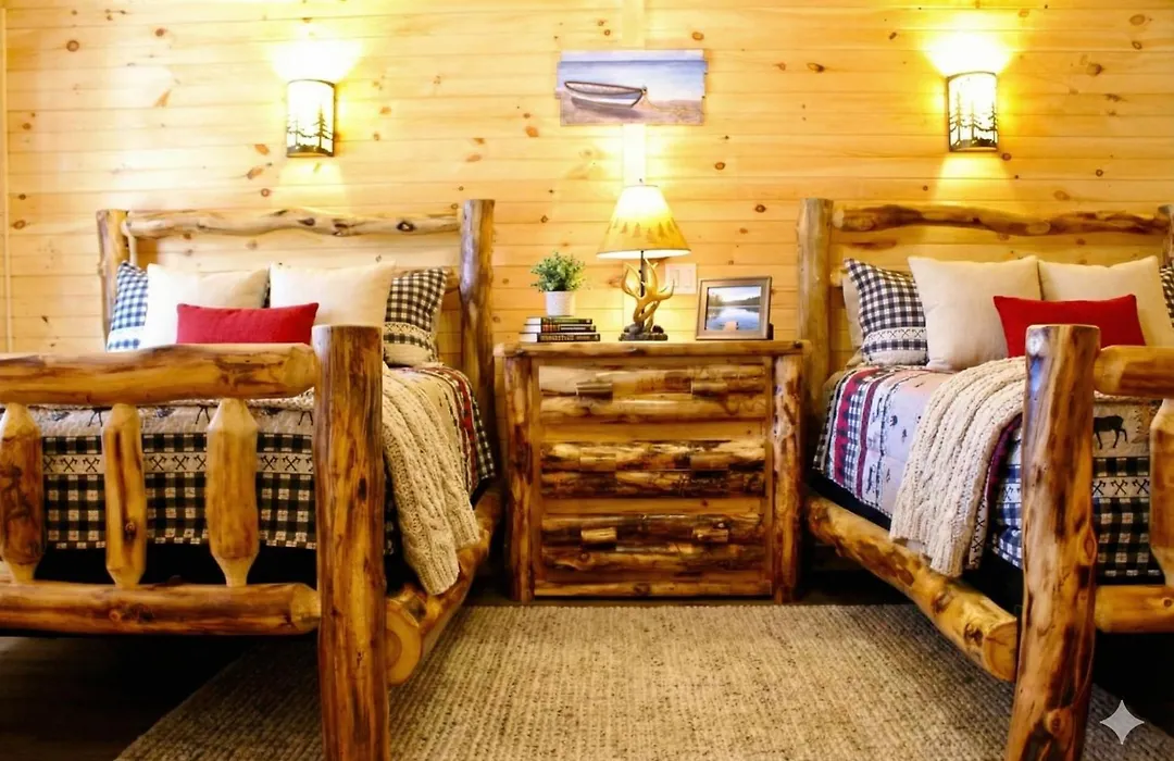 Rooms at The Sundowner On Lake George include lake view rooms with private balconies, rustic cabins with kitchens, and Adirondack suites with various amenities. Each cabin features an eat-in kitchen equipped with a stainless steel stove, full-size refrigerator, and cooking utensils.