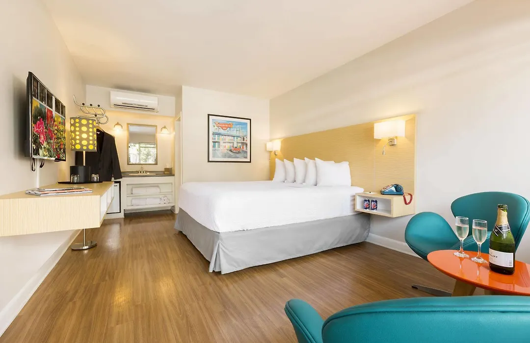 Every room at The Thunderbird Inn includes amenities like air conditioning, premium bedding, and free WiFi. Some rooms feature a seating area and a private bathroom with designer toiletries. There's no closet space, only a metal clothing rack with hangers bolted to the wall.