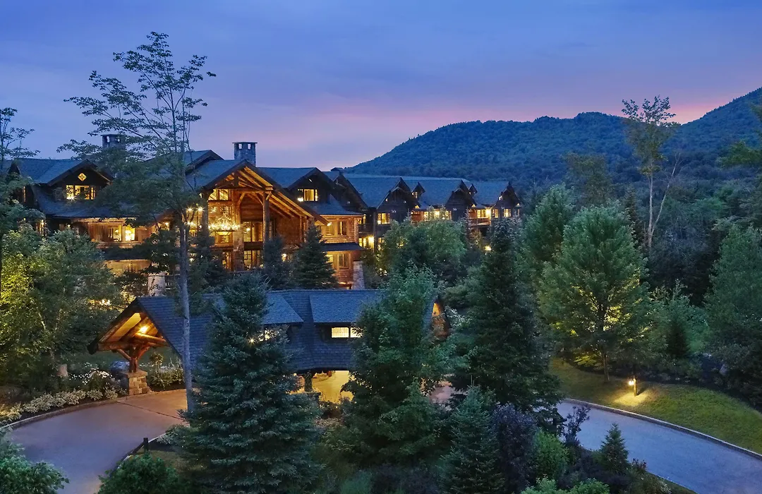 Accommodations at The Whiteface Lodge include spacious suites accommodating up to 12 guests, featuring fully equipped kitchens, cast iron fireplaces, and private balconies or porches with expansive views. The Presidential Suite offers 3100 square feet of luxury living, complete with custom features accessible by private elevator.