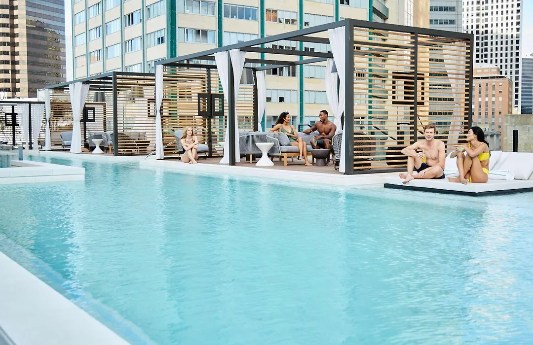 Thompson Dallas, By Hyatt is a 5-star hotel housed inside the former First National Bank building in the downtown business district. It features an outdoor swimming pool, a fitness center, and two on-site restaurants, including the American cuisine restaurant, CatBird. The hotel offers a commendable 8.6/10 rating on Booking.com.